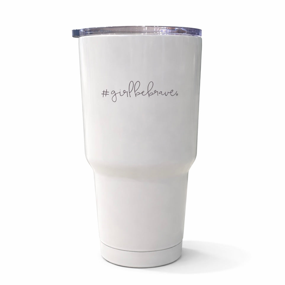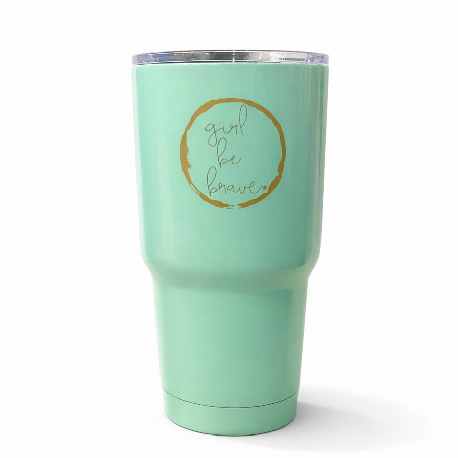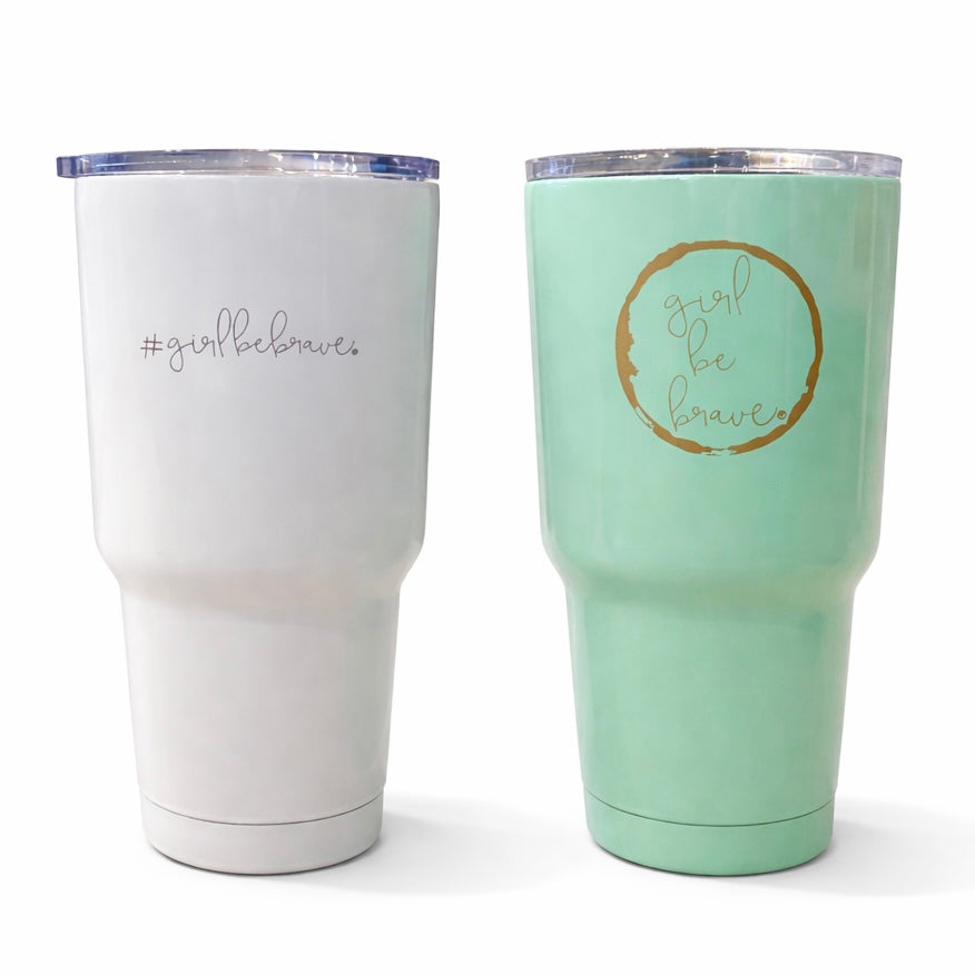 Ideal for your day at the beach or the office, this cup holds a generous 30oz of your favorite beverage. Girl Be Brave powder coated tumblers keep your drinks the perfect temperature all day long. It comes in two styles, white with #girlbebrave or green with round logo.