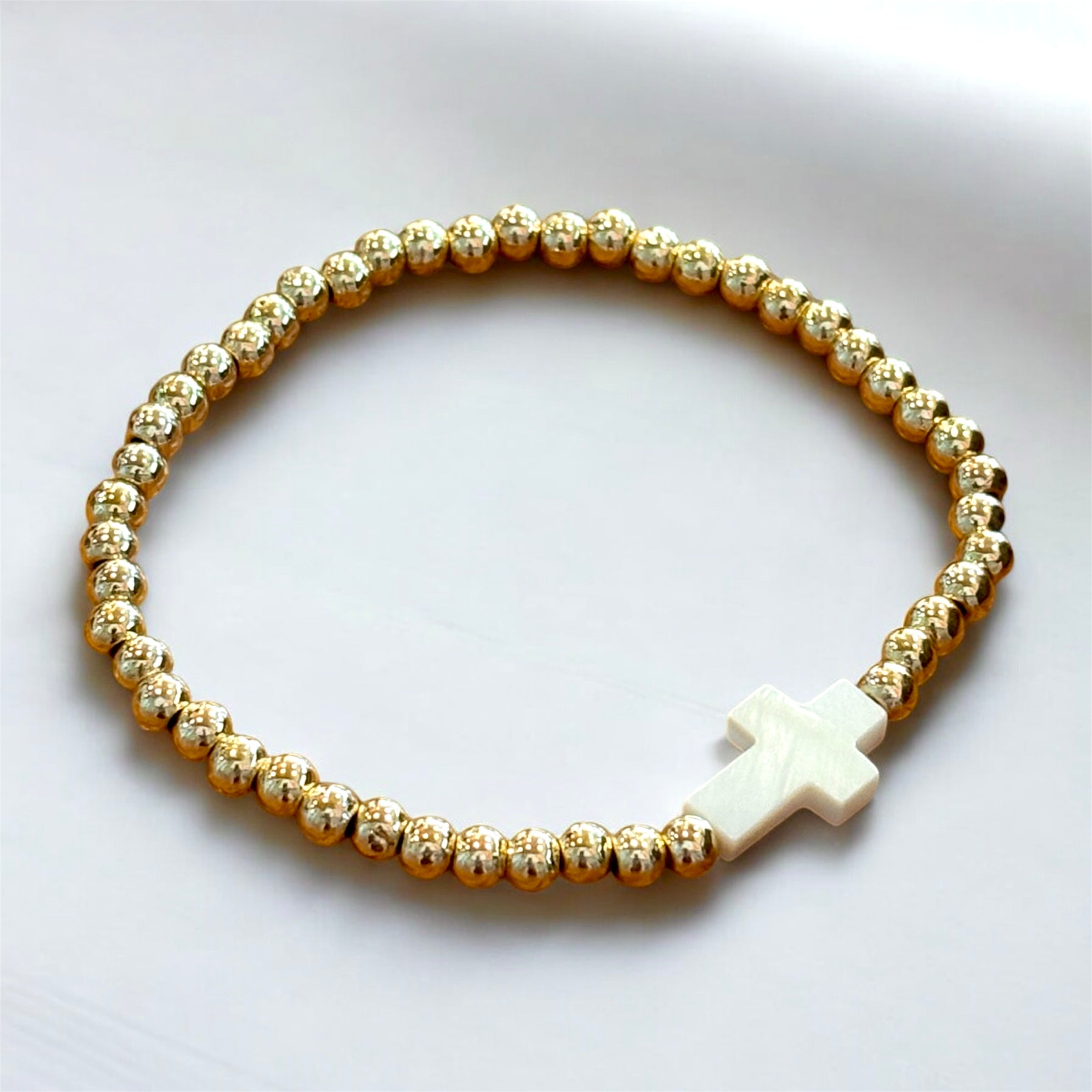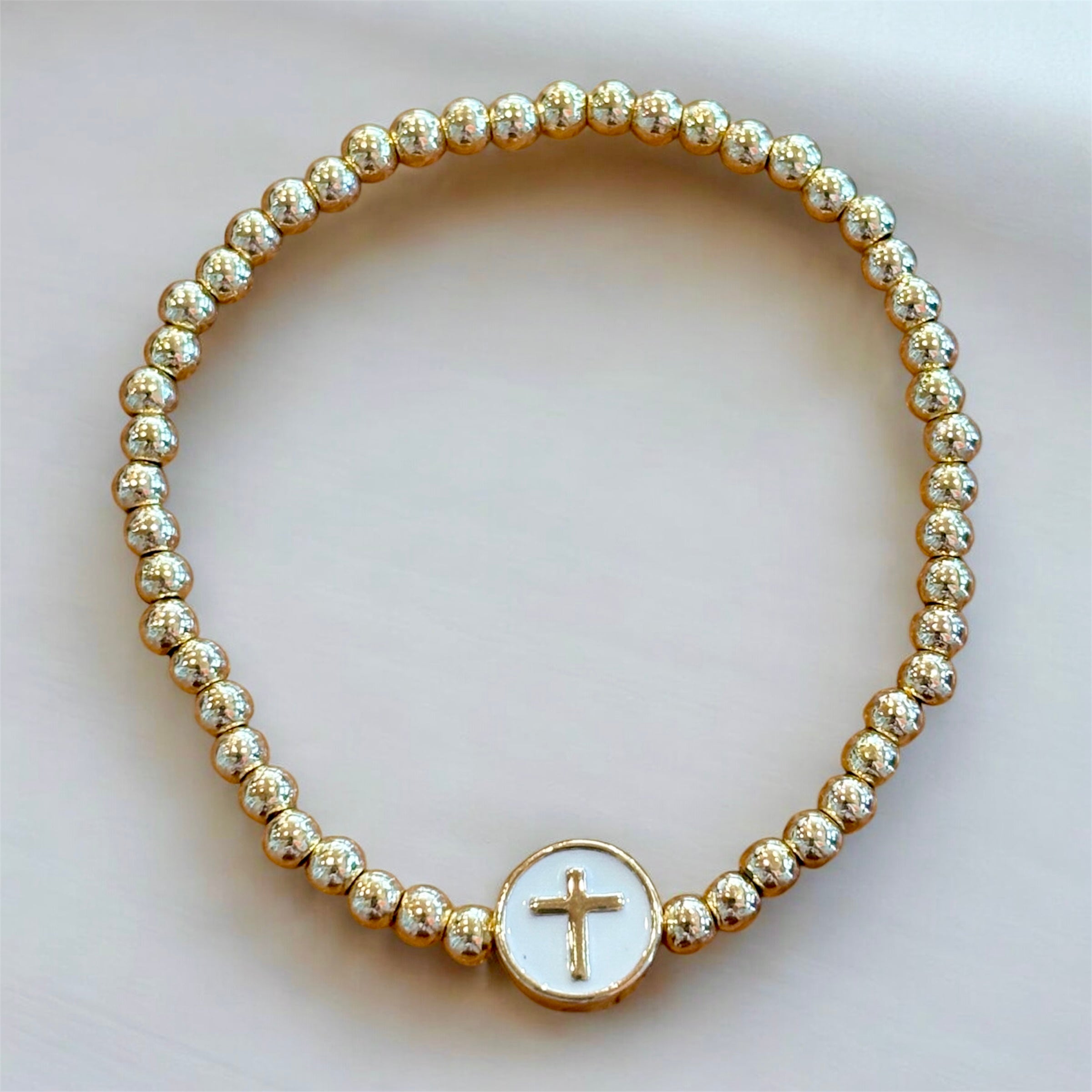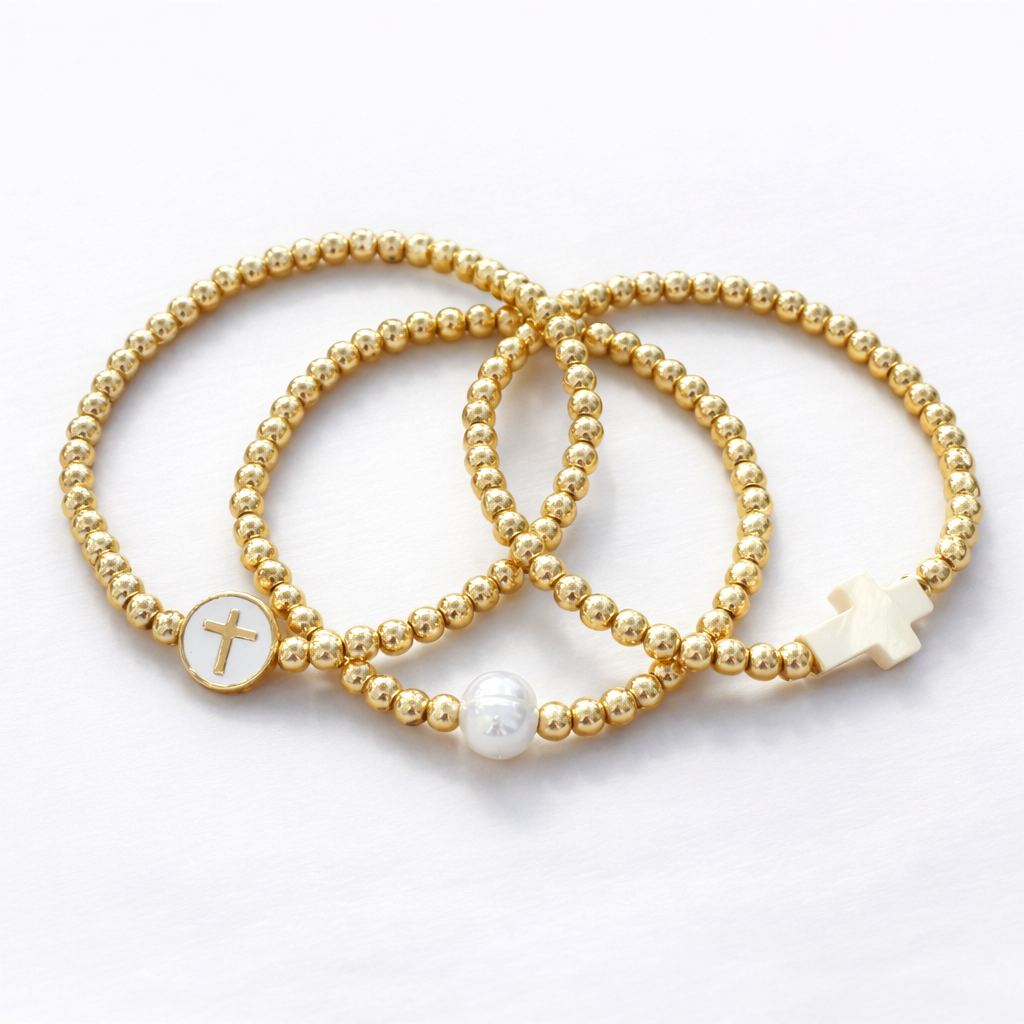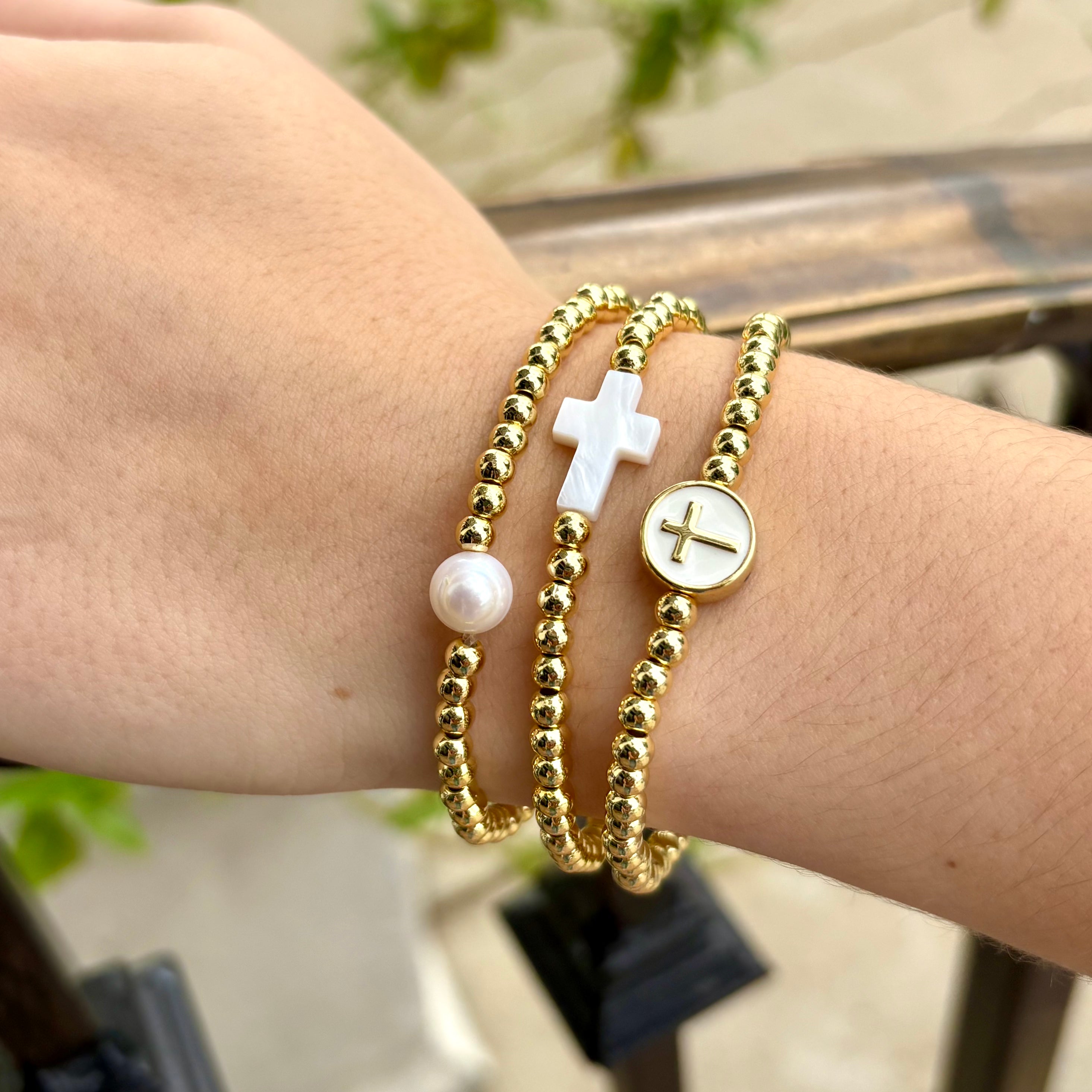 Gilded Harmony Bracelets are elegant, faith-inspired pieces designed to be worn your way. Each bracelet features polished gold beads and is available in three individual styles: one accented with a crisp white cross, one with a delicate cross set inside a petite medallion, and one finished with a single luminous pearl.