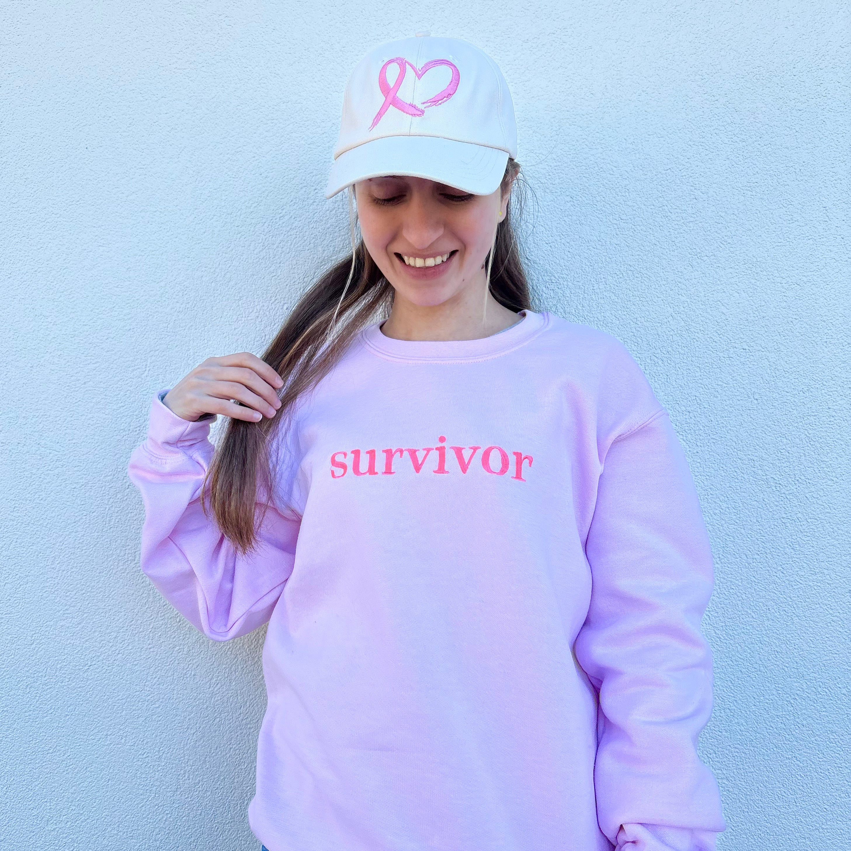 Crafted from a soft, premium cotton-blend fleece, this sweatshirt offers warmth and comfort while carrying a powerful message of hope. The word “Survivor” is proudly displayed in elegant script across the chest, symbolizing victory, empowerment, and self-love.